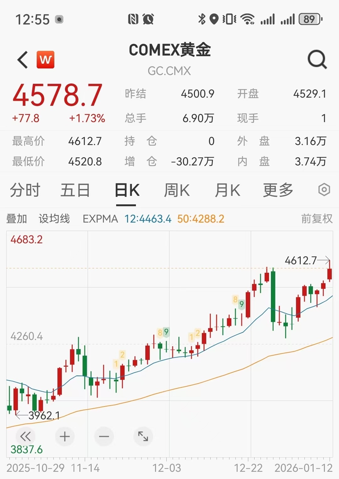 1月12日,国际金价再创历史新高。截至北京时间12时52分,伦敦金现高位触及4600.79美元/盎司,日内涨超0.6%。COMEX黄金最高价也突破4610美元/盎司,日内涨幅逼近2%。