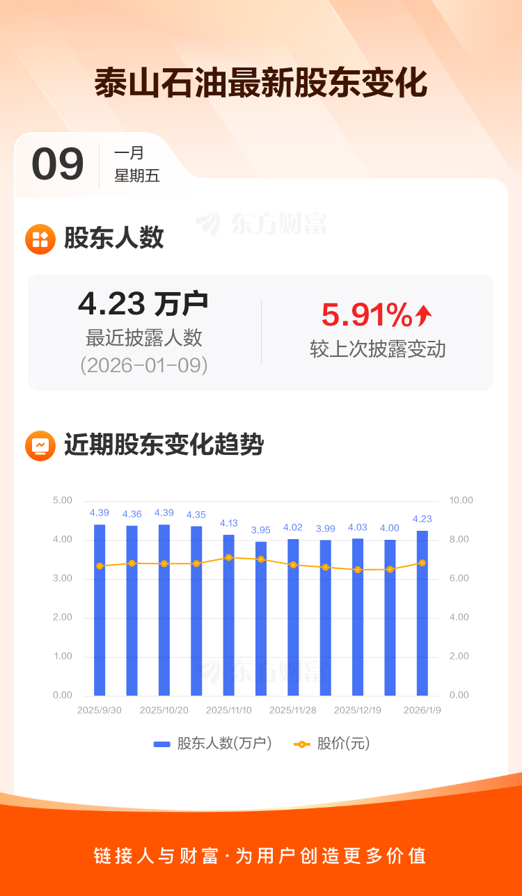 泰山石油:截至1月9日最新股东户数4.23万户,较上期增加5.91%
