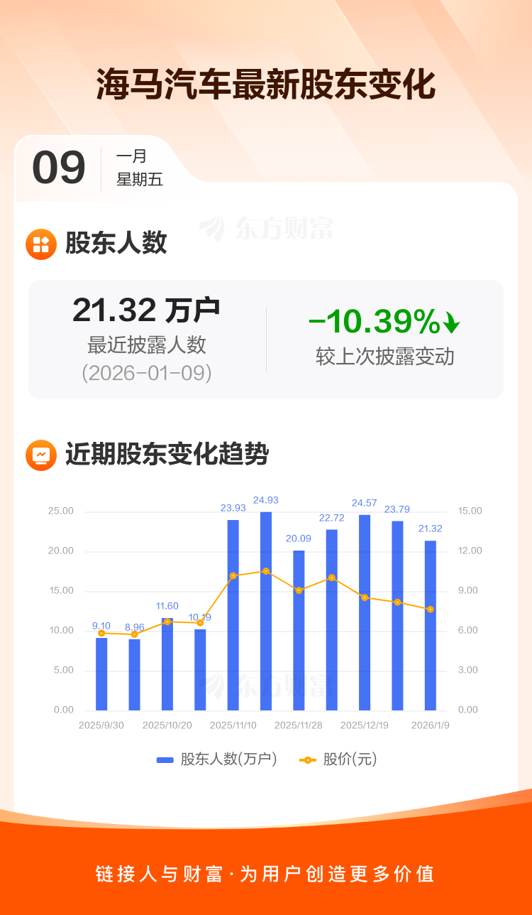 海马汽车:截至1月9日最新股东户数21.32万户,较上期减少10.39%