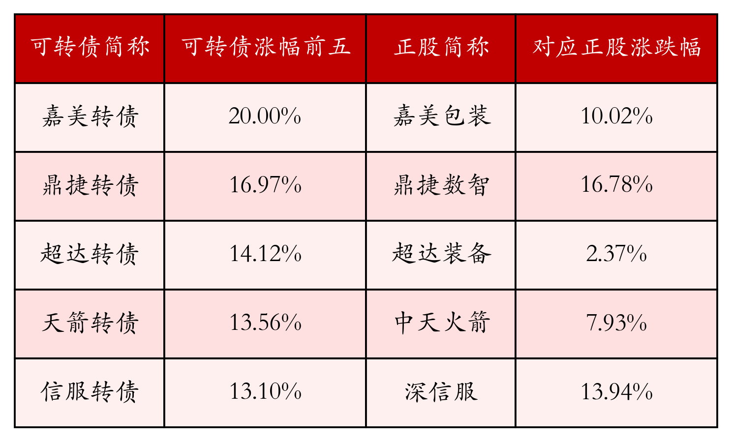 21智讯1月12日电,南财金融终端盘后数据显示,债市方面,中证转债指数收涨1.37%,报520.82,成交额为1079.73亿元。可转债方面,今日共成交380只可转债,其中331只收涨,1只收平,48只收跌。具体来看,103只可转债涨幅超过2%。其中嘉美转债(127042)涨20.0%,鼎捷转债(123263)涨16.97%,超达转债(123187)涨14.12%。今日有5只可转债跌幅超2%,天源转债(123213)跌5.59%,华锐转债(118009)跌4.58%,声迅转债(127080)跌2.89%。存在交易量的可转债所对应的正股中,265只收涨,11只收平,104只收跌。具体来看,48只可转债对应正股涨幅超过5%,其中,卫宁健康(300253)涨停,收涨19.98%。同时所对应的可转债:卫宁转债(123104)同涨2.06%。今日有3只可转债对应正股跌幅超过5%,没有正股跌停。