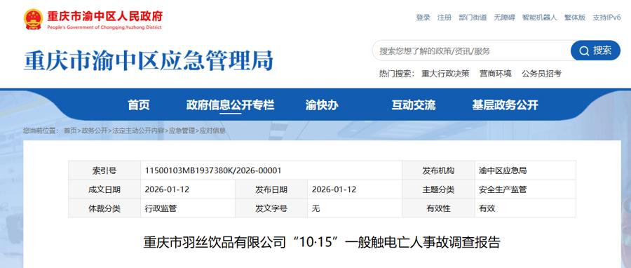 重庆市渝中区2026年1月12日发布一起触电亡人事故的调查报告。2025年10月15日22时56分许,在重庆来福士商场01层88、89号茶颜悦色品牌门店处更换灯具作业现场发生一起一般触电亡人事故,导致1人死亡。