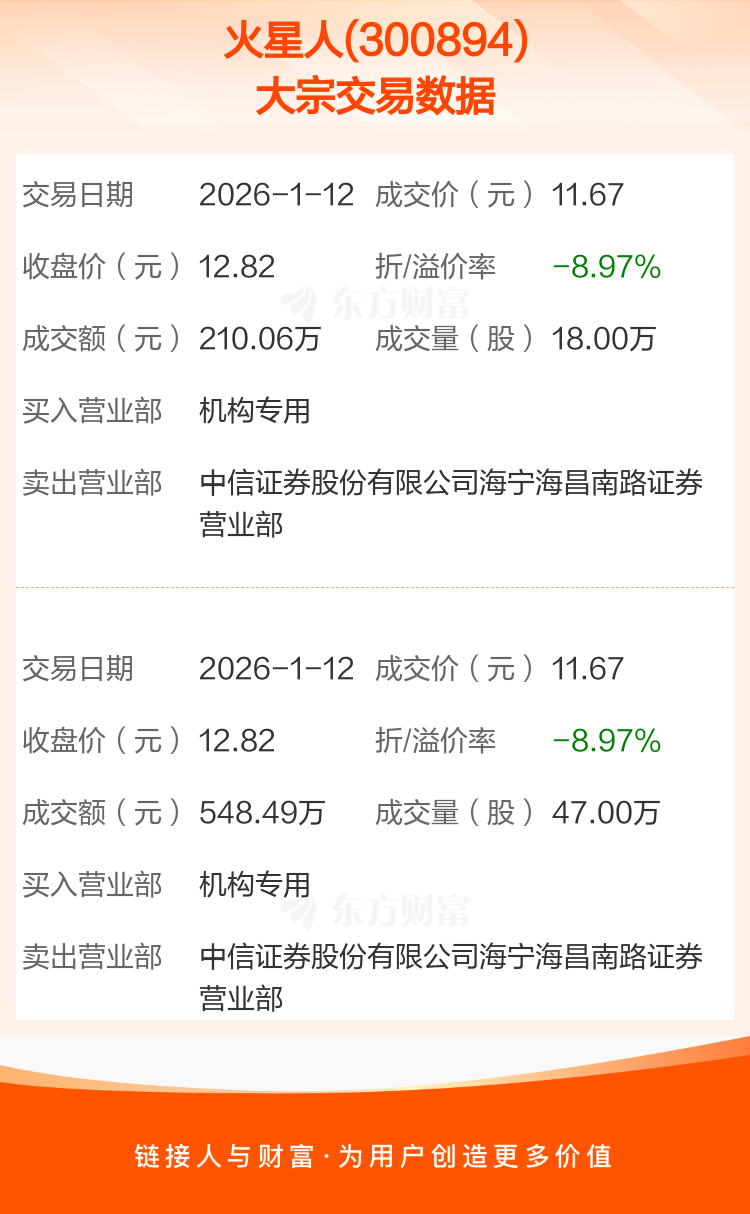 2026年1月12日,火星人发生2笔大宗交易,共成交65.00万股,成交金额758.55万元,占其流通市值比例为0.20%。