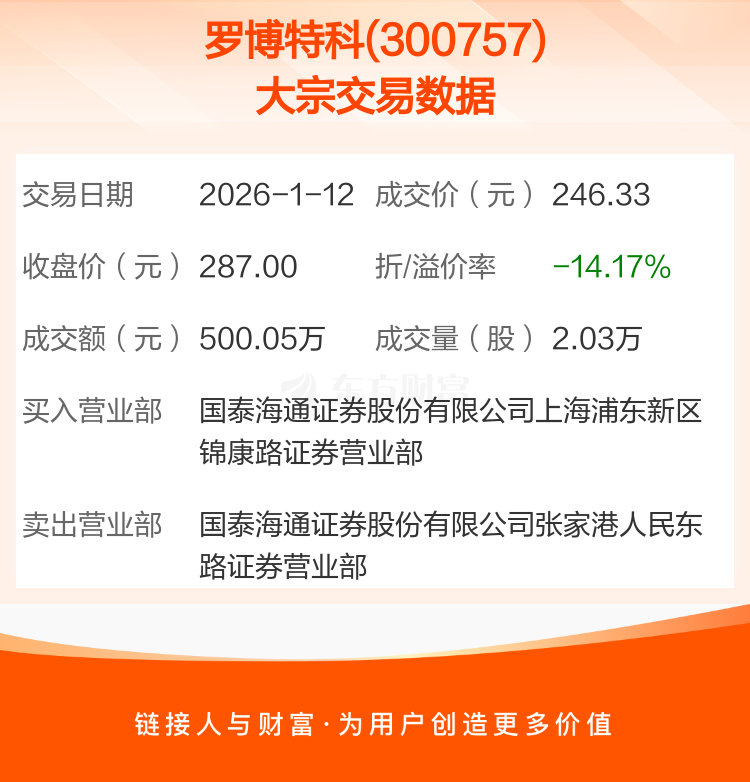2026年1月12日,罗博特科发生1笔大宗交易,共成交2.03万股,成交金额500.05万元,占其流通市值比例为0.01%。