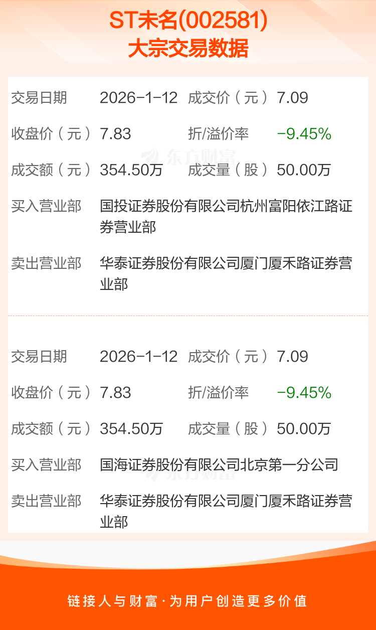 2026年1月12日,ST未名发生2笔大宗交易,共成交100.00万股,成交金额709.00万元,占其流通市值比例为0.23%。