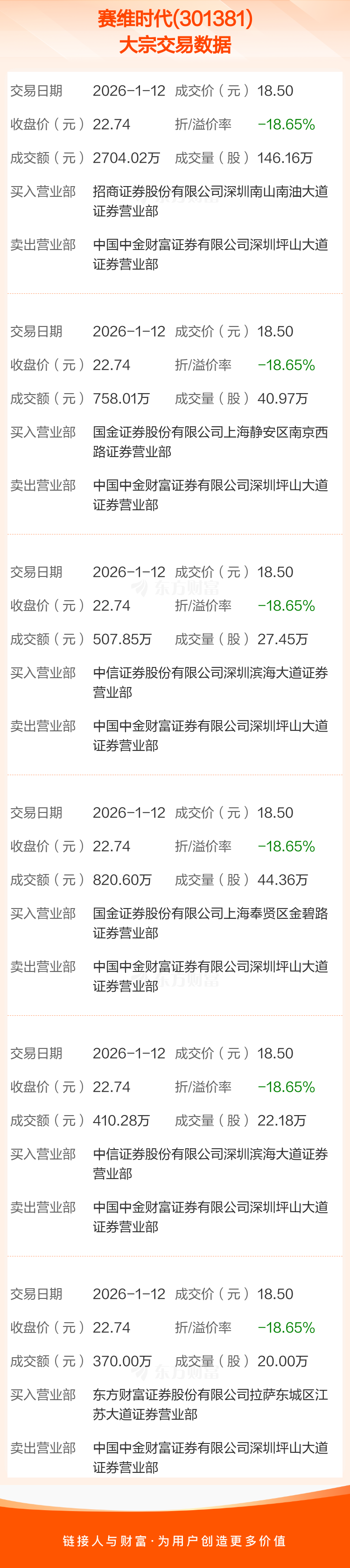 2026年1月12日,赛维时代发生6笔大宗交易,共成交301.12万股,成交金额5570.76万元,占其流通市值比例为1.25%。
