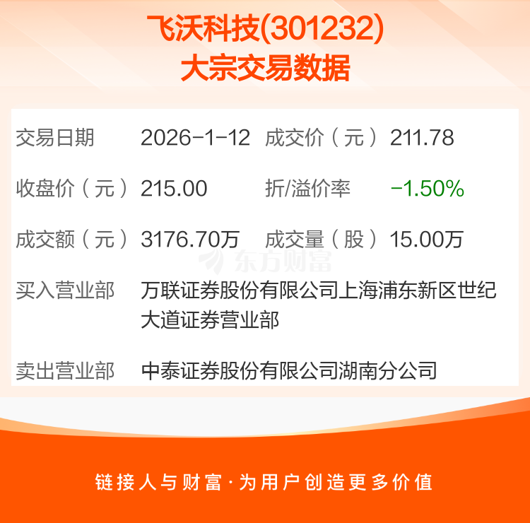 2026年1月12日,飞沃科技发生1笔大宗交易,共成交15.00万股,成交金额3176.70万元,占其流通市值比例为0.33%。