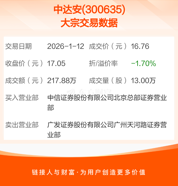2026年1月12日,中达安发生1笔大宗交易,共成交13.00万股,成交金额217.88万元,占其流通市值比例为0.11%。