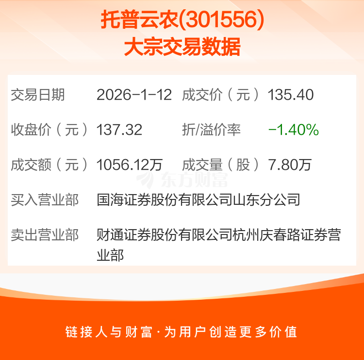 2026年1月12日,托普云农发生1笔大宗交易,共成交7.80万股,成交金额1056.12万元,占其流通市值比例为0.26%。