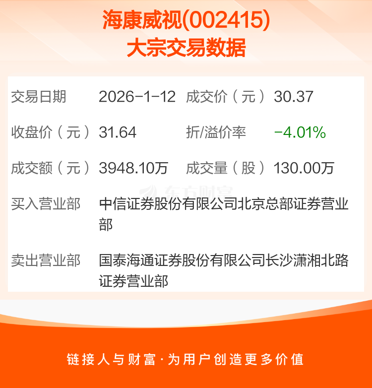 2026年1月12日,海康威视发生1笔大宗交易,共成交130.00万股,成交金额3948.10万元,占其流通市值比例为0.01%。