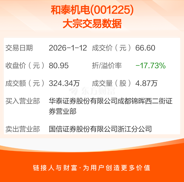 2026年1月12日,和泰机电发生1笔大宗交易,共成交4.87万股,成交金额324.34万元,占其流通市值比例为0.19%。