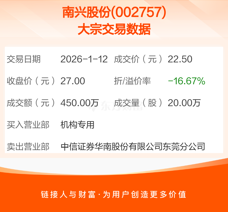 大宗交易:南兴股份成交450.00万元,折价16.67%(1-12)