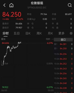 白银同步上涨。同日,沪银期货主力合约涨幅一度扩大至14%;现货白银涨近6%,突破84美元/盎司,再创历史新高。截至15:03,报84.250美元/盎司。
