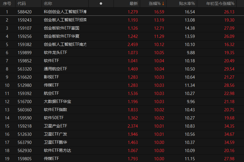 截至1月12日收盘,科创创业人工智能ETF摩根、创业板人工智能ETF招商、创业板软件ETF富国、创业板软件ETF华夏涨幅分别达到16.59%、13.19%、12.71%、11.29%。另外,软件龙头ETF、软件ETF、通用航空ETF、影视ETF、传媒ETF及卫星板块多只ETF纷纷涨停。
