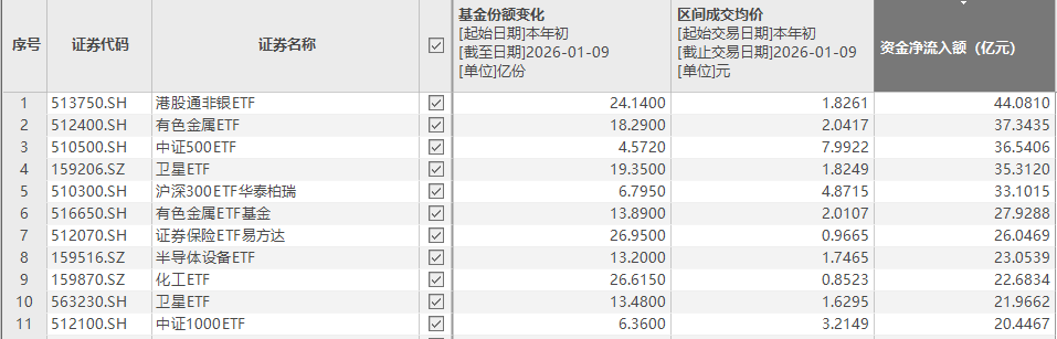 年初至今,多只ETF持续迎来资金净流入。Choice数据显示,今年以来截至1月9日,有色金属ETF、中证500ETF、卫星ETF、沪深300ETF华泰柏瑞均迎来30亿元以上资金净流入。此外,有色金属ETF基金、证券保险ETF易方达、半导体设备ETF等产品迎来20亿元以上资金净流入。