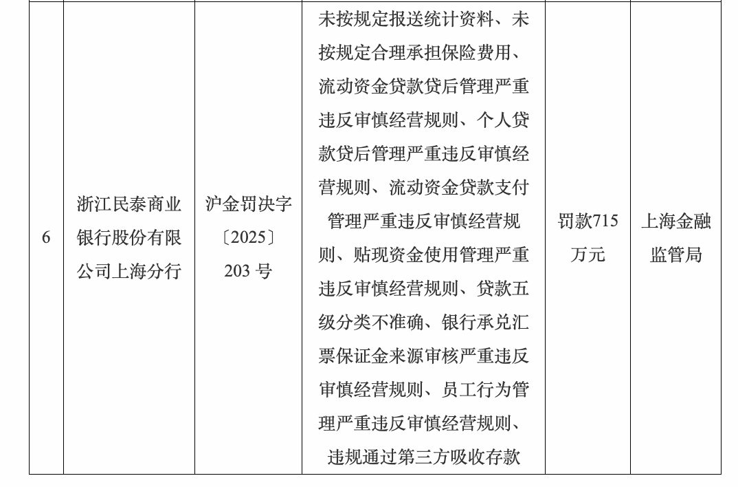 涉10项违法违规行为!浙江民泰商业银行一省级分行被罚715万元