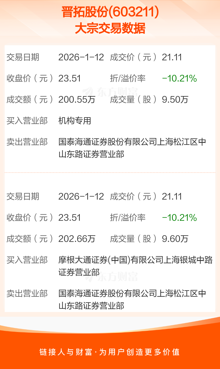 2026年1月12日,晋拓股份发生2笔大宗交易,共成交19.10万股,成交金额403.21万元,占其流通市值比例为0.06%。