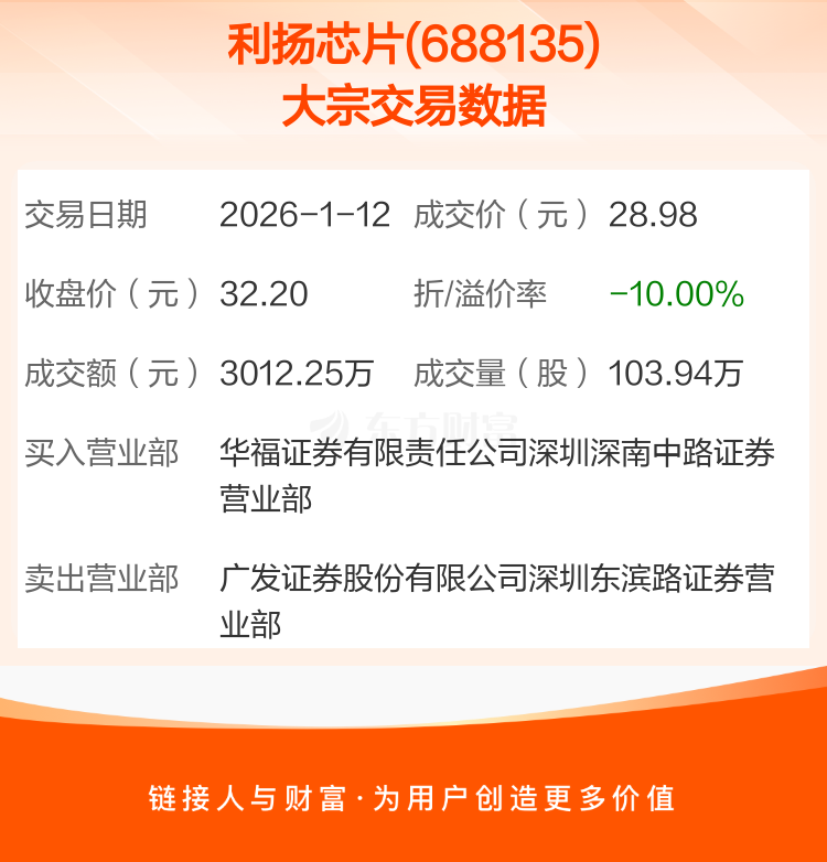 2026年1月12日,利扬芯片发生1笔大宗交易,共成交103.94万股,成交金额3012.25万元,占其流通市值比例为0.46%。