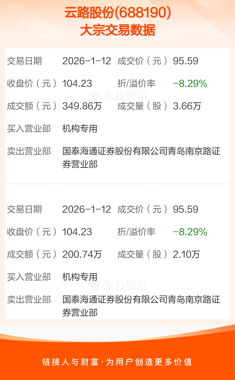 2026年1月12日,云路股份发生2笔大宗交易,共成交5.76万股,成交金额550.60万元,占其流通市值比例为0.04%。