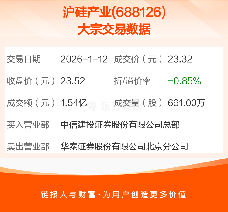 2026年1月12日,沪硅产业发生1笔大宗交易,共成交661.00万股,成交金额1.54亿元,占其流通市值比例为0.24%。