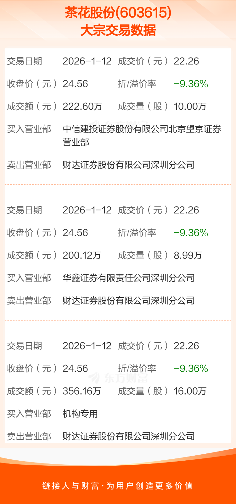 2026年1月12日,茶花股份发生3笔大宗交易,共成交34.99万股,成交金额778.88万元,占其流通市值比例为0.13%。