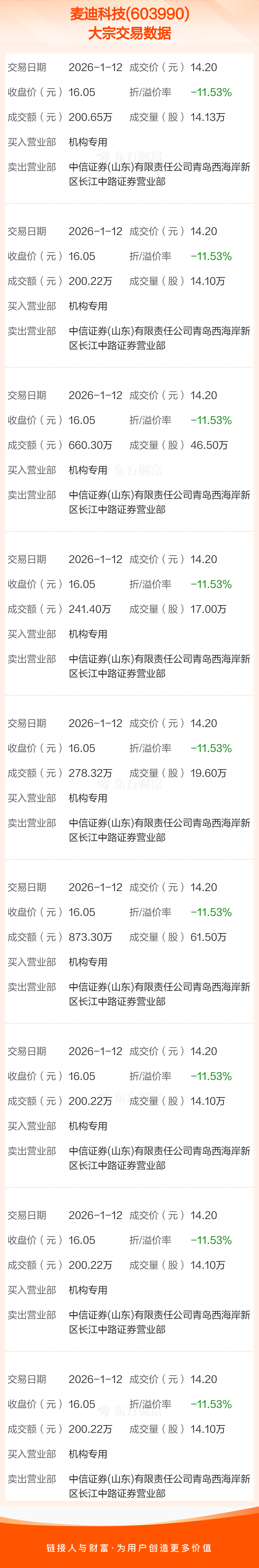 2026年1月12日,麦迪科技发生9笔大宗交易,共成交215.13万股,成交金额3054.85万元,占其流通市值比例为0.62%。