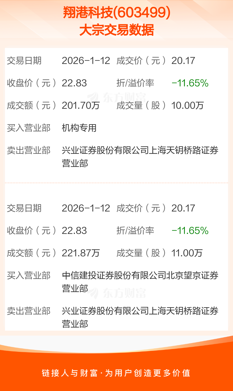 2026年1月12日,翔港科技发生2笔大宗交易,共成交21.00万股,成交金额423.57万元,占其流通市值比例为0.06%。