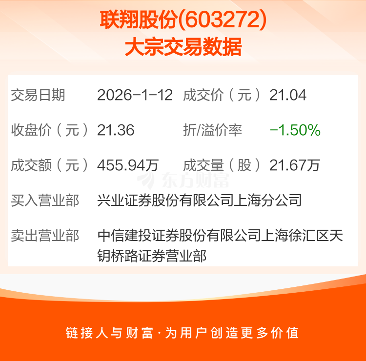 2026年1月12日,联翔股份发生1笔大宗交易,共成交21.67万股,成交金额455.94万元,占其流通市值比例为0.21%。