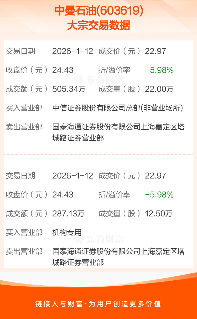 2026年1月12日,中曼石油发生2笔大宗交易,共成交34.50万股,成交金额792.47万元,占其流通市值比例为0.07%。