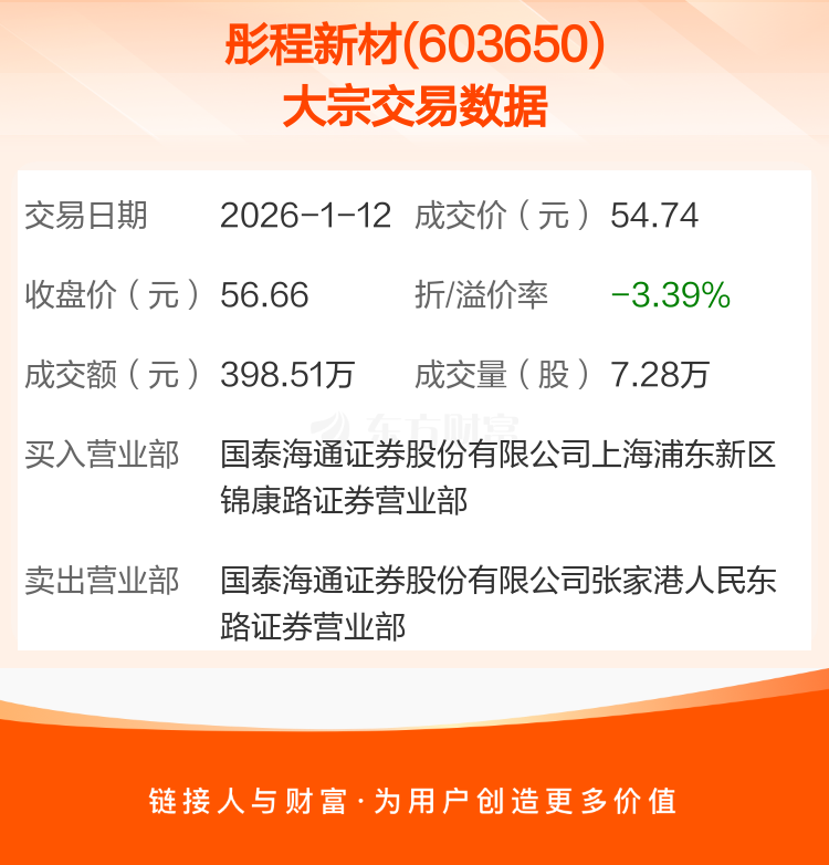 2026年1月12日,彤程新材发生1笔大宗交易,共成交7.28万股,成交金额398.51万元,占其流通市值比例为0.01%。
