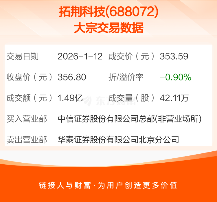 2026年1月12日,拓荆科技发生1笔大宗交易,共成交42.11万股,成交金额1.49亿元,占其流通市值比例为0.15%。
