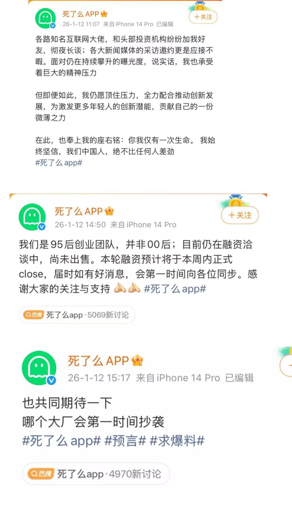 1月12日,独居安全APP“死了么”官方账号发布博文称:“我们是95后创业团队,并非00后;目前仍在融资洽谈中,尚未出售。本轮融资预计将于本周内正式close(完成),届时如有好消息,会第一时间向各位同步。”