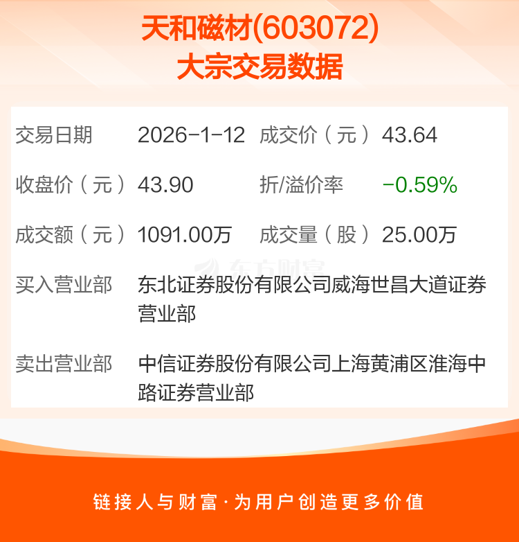 2026年1月12日,天和磁材发生1笔大宗交易,共成交25.00万股,成交金额1091.00万元,占其流通市值比例为0.20%。