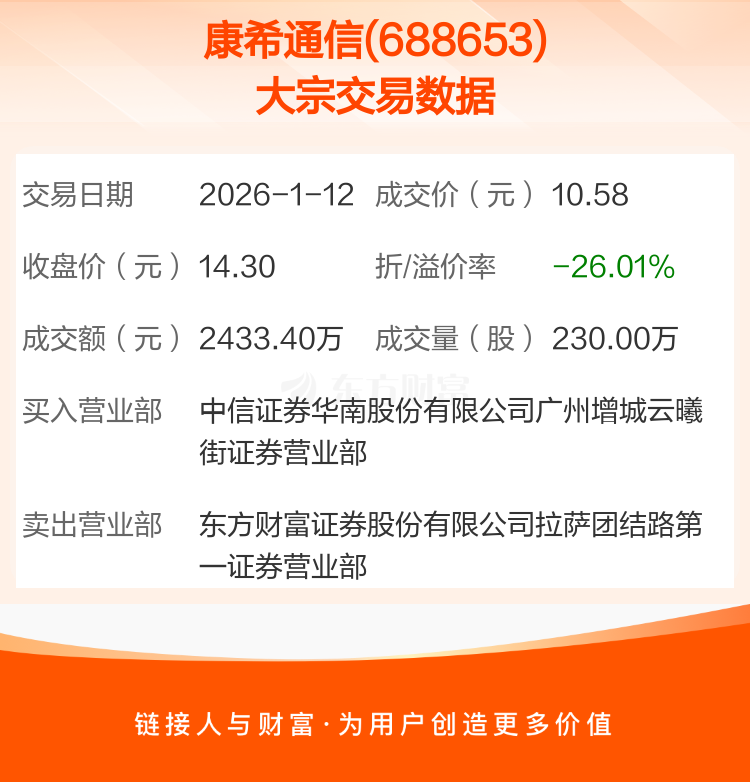 2026年1月12日,康希通信发生1笔大宗交易,共成交230.00万股,成交金额2433.40万元,占其流通市值比例为0.54%。