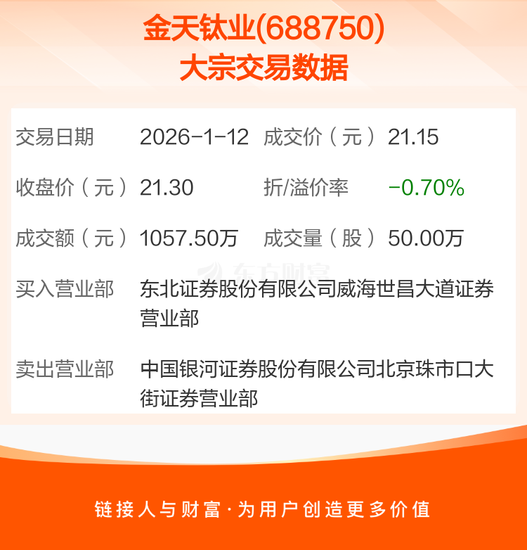 大宗交易:金天钛业成交1057.50万元,折价0.70%(1-12)