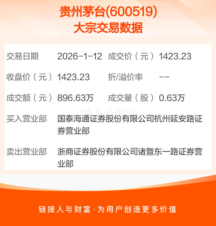 2026年1月12日,贵州茅台发生1笔大宗交易,共成交6300股,成交金额896.63万元。