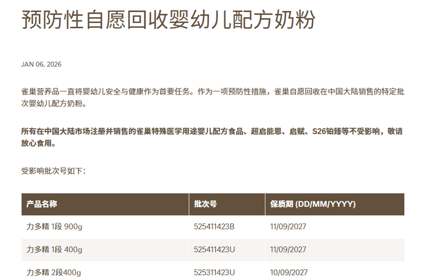 在此背景下,雀巢的召回行动率先在欧洲落地——1月5日晚间,其已在德国、奥地利、丹麦、意大利等多个欧洲国家启动自愿召回程序。紧随其后,1月6日雀巢正式发布“预防性自愿回收”公告,将召回范围延伸至中国市场,涉及力多精、铂初能恩、舒宜能恩等多款婴幼儿奶粉产品。