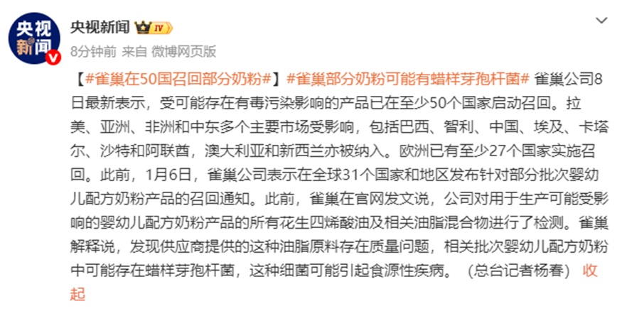 随后,雀巢婴幼儿配方奶粉的全球召回范围进一步扩大。当地时间1月8日雀巢表示,受可能存在有毒污染影响的产品已在至少50个国家和地区启动召回,较此前公布的30多个国家和地区明显增加。