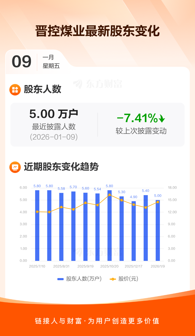 晋控煤业:截至1月9日最新股东户数5.00万户,较上期减少7.41%