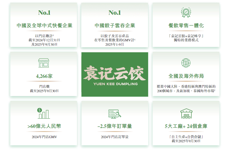 根据灼识咨询相关报告,截至2025年9月30日,按门店数量计,袁记食品是中国及全球最大的中式快餐公司。截至2025年9月30日止九个月期间,以饺子及云吞产品在零售及餐饮业的GMV计,袁记食品也是中国最大的饺子云吞企业。