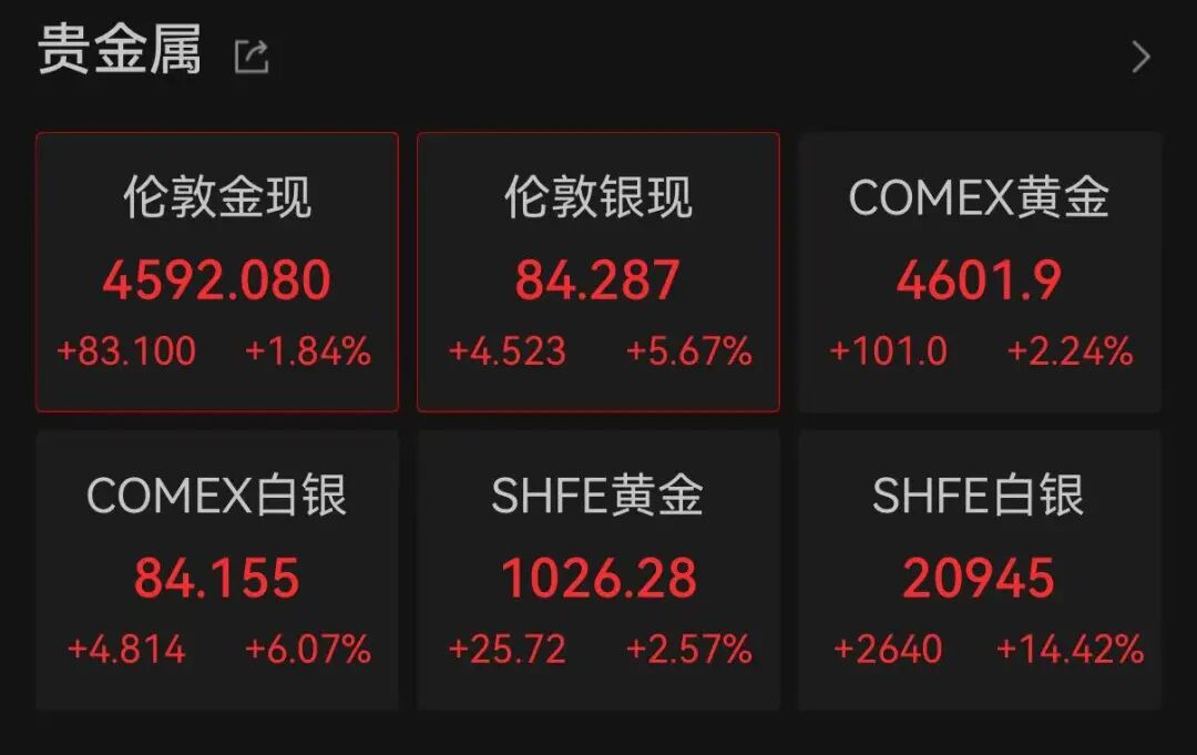 白银的表现更是“爆发力”十足。伦敦现货白银价格最高触及84.606美元/盎司,首次升破84美元/盎司,日内最大涨幅超6%;COMEX白银期货最高触及84.69美元/盎司,日内涨超6%,涨势远超黄金。