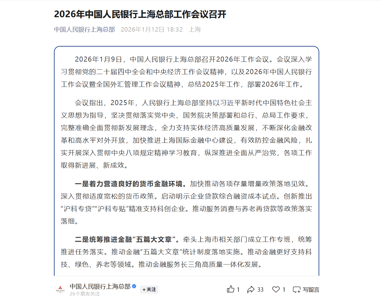 21世纪经济报道从中国人民银行上海总部了解到,1月9日,央行上海总部召开了2026年工作会议。