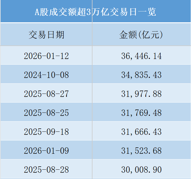 A股历史上,沪深京三市单日总成交额突破3万亿元的交易日共有7次: