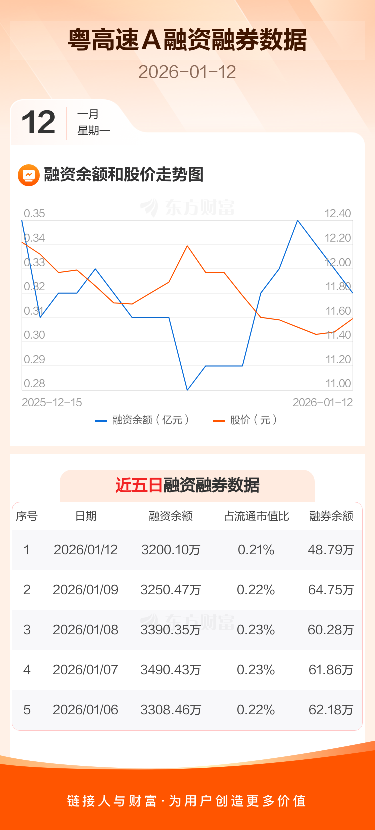 交易所最新数据显示,粤高速A于2026年1月12日获融资买入223.44万元,融资偿还273.81万元,当日融资净偿还50.37万元。目前,该股融资余额3200.10万,占流通市值比例为0.21%。