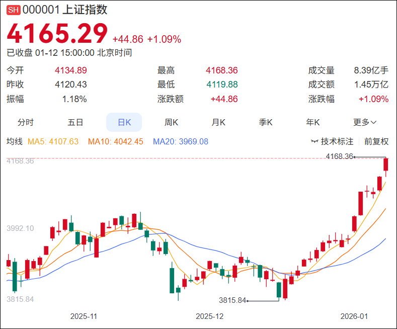 1月12日,A股单日成交额刷新历史纪录,首次站上3.6万亿元关口,超越此前3.49万亿元的历史高点。截至收盘,上证指数17连阳,报4165.29点,上涨1.09%;深成指涨1.75%报14366.91点;创业板指涨1.82%报3388.34点。