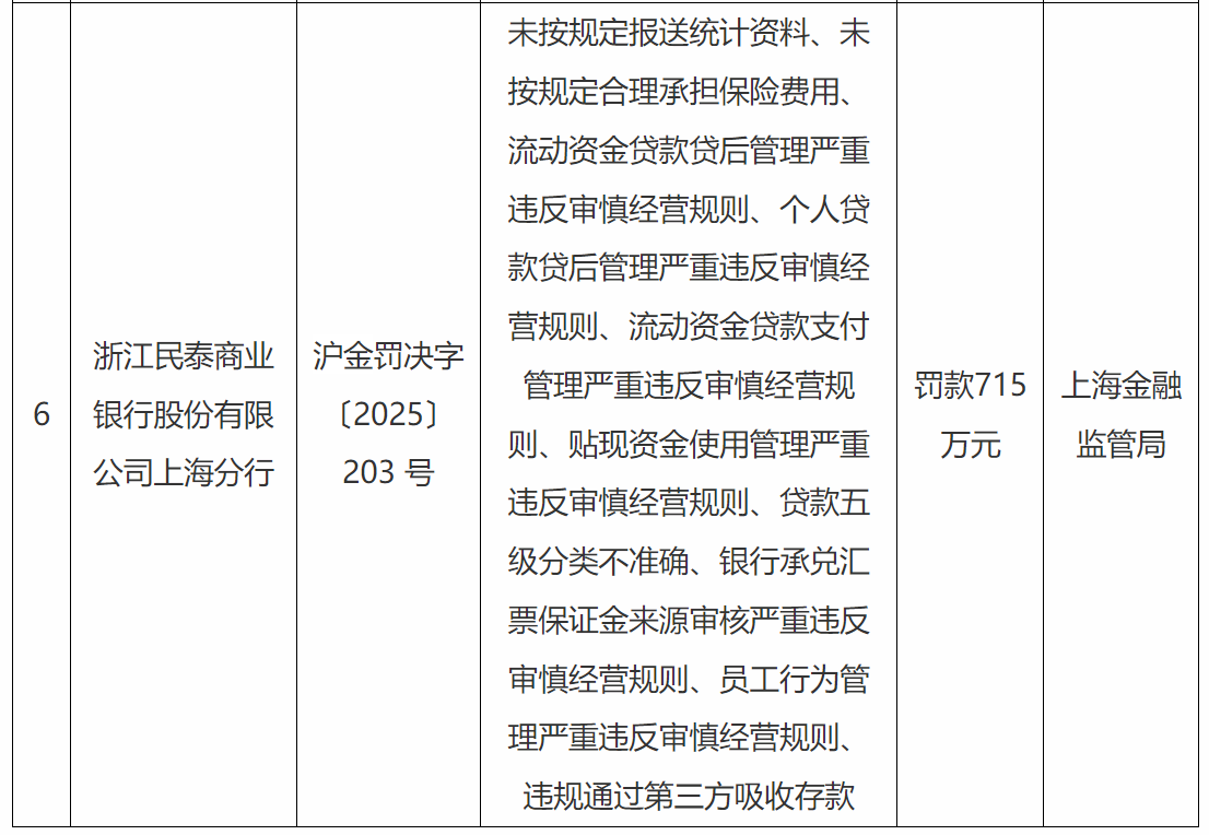 综上,上海金融监管局对民泰银行上海分行罚款715万元。