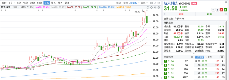 1月13日,连涨数日的商业航天板块出现久违的绿色数字。截至午间,航空航天(BK0480)、商业航天(BK0963)、航空航天ETF天弘一度跌幅达6.87%、5.72%、9.37%,航天科技(000901.SZ)跌幅达10%。