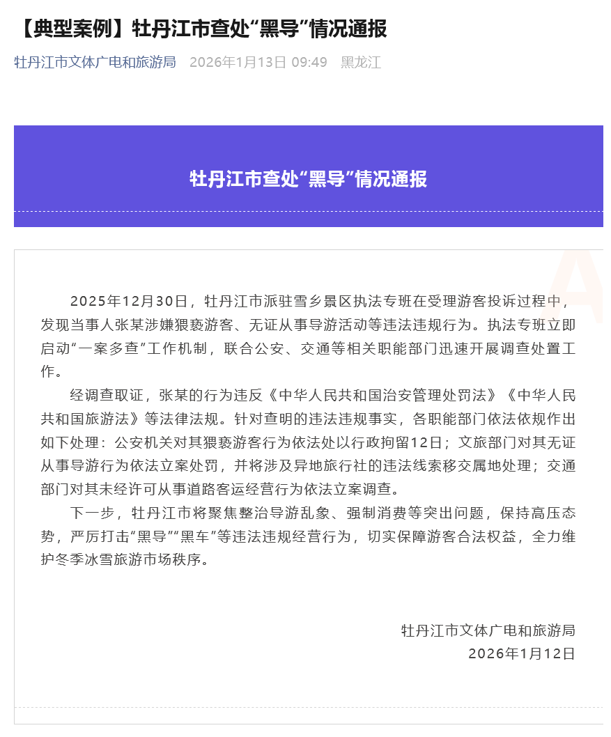 1月12日,黑龙江牡丹江市文体广电和旅游局发布查处“黑导”情况通报: