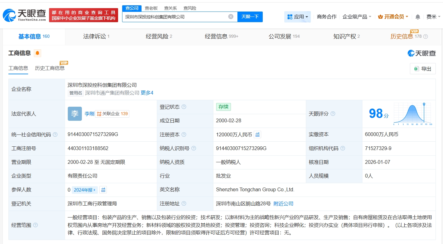 每经AI快讯,天眼查工商信息显示,近日,深圳市通产集团有限公司发生工商变更,企业名称变更为深圳市深投控科创集团有限公司,同时,注册资本由6亿元增至12亿元,增幅100%。深圳市深投控科创集团有限公司成立于2000年2月,法定代表人为李刚,经营范围包括包装产品的生产、销售以及包装行业的投资等。股东信息显示,该公司由深圳市投资控股有限公司、深圳市国有股权经营管理有限公司共同持股。