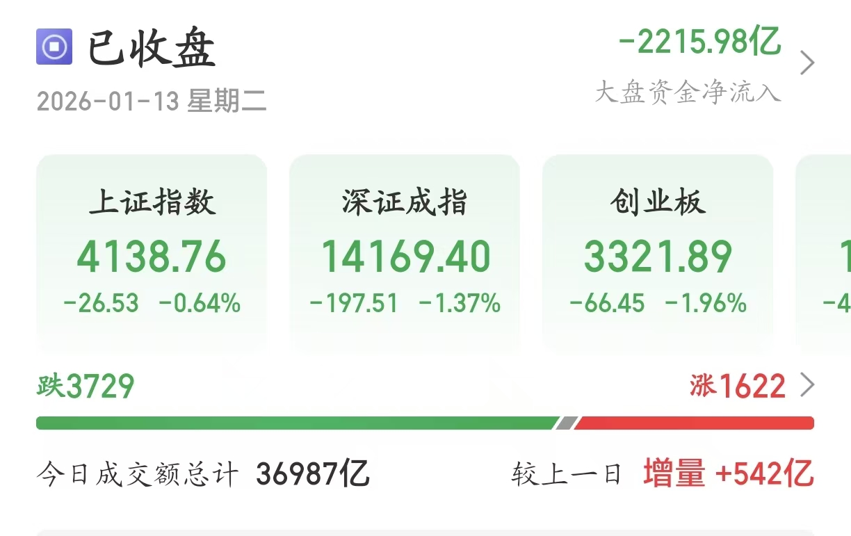 1月13日,A股大盘最长连阳纪录——17连阳终止。截至收盘,沪指下跌0.64%,报收4138.76点;深证成指下跌1.37%、创业板指下跌1.96%。