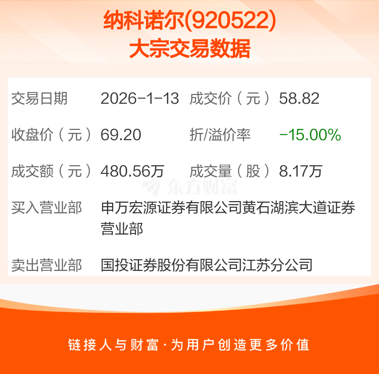 2026年1月13日,纳科诺尔发生1笔大宗交易,共成交8.17万股,成交金额480.56万元,占其流通市值比例为0.05%。